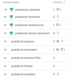 Achieved Top 3 SERP rankings for Perth and local keywords for ‘Podiatrist’ searches.
